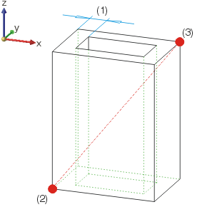 Hohlquader im Modus Punkte direkt: (1) Wandstärke (innen), (2) Anfangspunkt, (3) Endpunkt der Raumdiagonalen