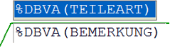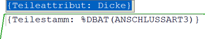 Teileattribute innerhalb eines Textblockes werden in geschweiften Klammern angezeigt, Datenbankattributen ist zusätzlich der String %DBAT vorangestellt, z.B.