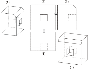 4 Ansichten: (1) Ausgangsteil, (2) von vorn, (3) von links, (4) von oben, (5) Axonometrie