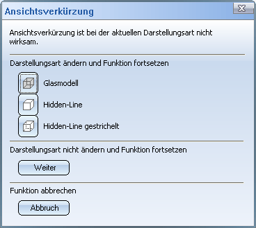 Kann die Ansichtsverkürzung nicht durchgeführt werden, z.B. weil eine schattierte OpenGL-Ansicht aktiv ist, dann erfolgt ein entsprechender Hinweis. Sie haben dann die Möglichkeit, die weitere Vorgehensweise zu bestimmen. Beispielsweise können Sie die Darstellungsart ändern und die Funktion direkt fortsetzen.