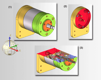 (1) 3D-Modell, (2) Schnitt mit YZ-Ebene als Clipebene, (3) Schnitt mit XY-Ebene als Clipebene