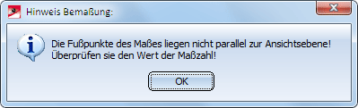 Wenn bei der Winkelbemaßung die durch die identifizierten Schenkel bestimmten Maßfußpunkte nicht parallel zur aktuellen Ansichtsebene liegen, dann wird die folgende Meldung angezeigt: