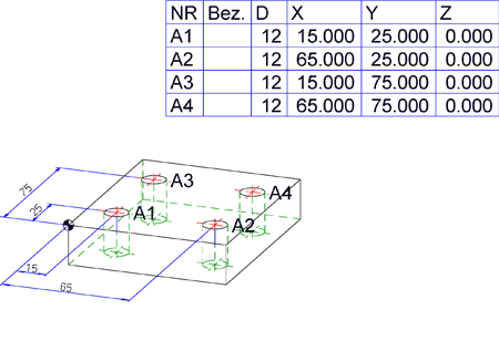 3D Bemaßung + Text > Tools > Extras > Bohrungstabelle