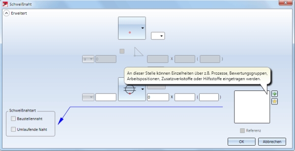 . Die Bedienung des anschließend angezeigten Dialogfensters erfolgt im Wesentlichen analog zur Funktion Schweißnahtsymbol einfügen, es stehen aber nicht alle dort verfügbaren Optionen zur Verfügung.