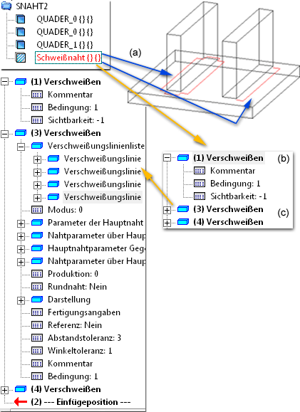 Im abgebildeten Beispiel sind zunächst - in einem Arbeitsschritt - die Schweißnähte links erzeugt worden. Dabei wurde das Hauptteil Schweißnaht (a) erzeugt. Anschließend ist bei aktivem Schweißnaht-Hauptteil die Schweißnahtfunktion erneut aufgerufen und die rechte Schweißnaht erzeugt worden. Das Featureprotokoll enthält dann das Erzeugungsfeature (b) und zwei Schweißnahtfeature (c), wobei im Beispiel das Feature (3) für die zuerst erzeugten Schweißnähte steht (daher auch vier Einträge unter Verschweißungslinienliste).