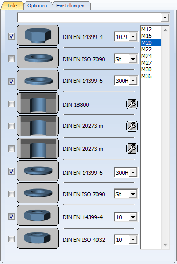 Um ein Teil für die Verschraubung auszuwählen, aktivieren Sie die entsprechende
