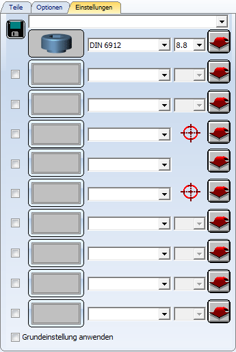 Über die Registerkarte Teile erreichen Sie alle verfügbaren Schrauben, Scheiben, Muttern, Bohrungen, Senkungen und Gewinde, aus denen die Verschraubung bestehen kann.