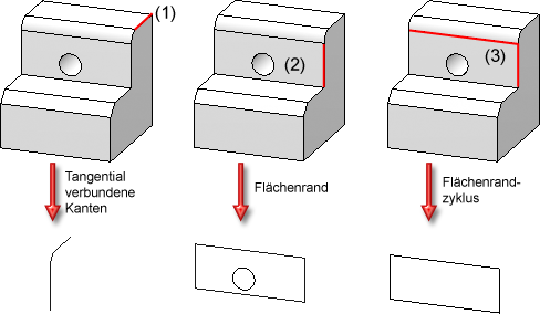 Verbundene Kanten Mit dieser Funktion lassen sich in einem Schritt alle mit der nächsten identifizierten Kante verbundenen Kanten übernehmen. Die Kanten werden solange übernommen bis die Fortsetzung nicht mehr eindeutig ist. Dies gilt nicht für Kanten eines Solids. |