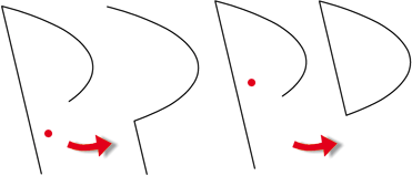 Liegt der Punkt innerhalb des Linienelementes, dann wird das Element verkürzt. Dabei bedeutet innerhalb, dass der Punkt zwischen den gedachten Geraden liegt, die senkrecht zur Strecke durch die beiden Endpunkte verlaufen. Für den Kreisbogen gilt eine sinngemäße Definition.