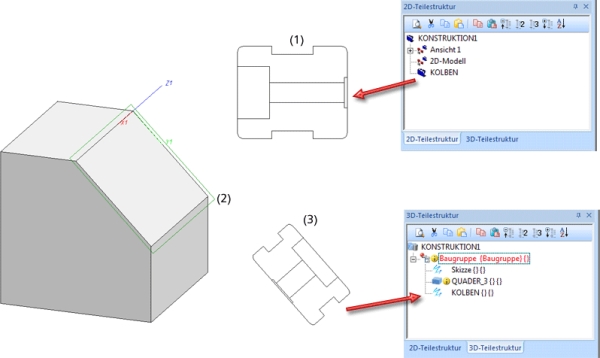 (1) 2D-Teil, (2) aktive Bearbeitungsebene, (3) entstandene Skizze