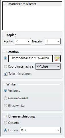 Rotatorisches Muster Die Eingabefelder sind identisch mit denen der Funktion Teil wiederholen, Drehen parametrisch. |