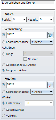 Verschieben und Drehen Die Eingabefelder sind identisch mit denen der Funktion Teil wiederholen, Drehen - parametrisch mit Verschiebung. |