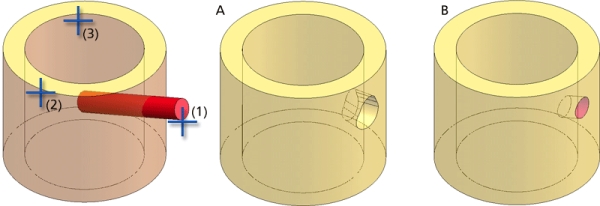Die Abbildung zeigt als Kollisionsteil (1) einen Zylinder, der ein Rohr durchdringt. Als Flächen sind die Außen- (2) und die Innenfläche (3) des Rohres gewählt worden. A zeigt das Ergebnis mit Schnittluft, B zum Vergleich das Ergebnis einer Subtraktion.