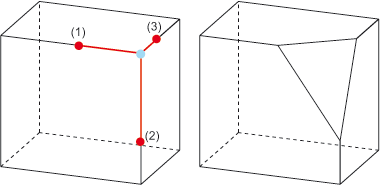 Hier werden die in der Ecke aufeinander treffenden Kanten durch Angabe von drei Längenwerten gefast. Geben Sie die drei Längenwerte ein. Die Feldtexte im Eingabefenster werden in unterschiedlichen Farben dargestellt. Nach der Identifizierung einer Ecke werden die Kanten, für die der jeweilige Längenwert gilt, in der entsprechenden Farbe markiert.