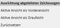 Wenn Sie mit der Funktion Zeichnungsableitung arbeiten, haben Sie im Kontextmenü für 3D-Teile zusätzlich die Möglichkeit, zu bestimmen, ob die aktive Ansicht bei der Zeichnungsableitung als Vorderansicht oder Draufsicht gelten soll. Sie finden die Funktionen unter Eigenschaften > Ausrichtung abgeleiteter Zeichnungen.