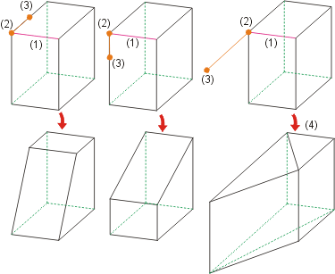 Mit diesen Funktionen modellieren Sie 3D-Teile durch Verschiebung einzelner Kanten. Zur Angabe des Verschiebevektors stehen verschiedene Möglichkeiten zur Verfügung: