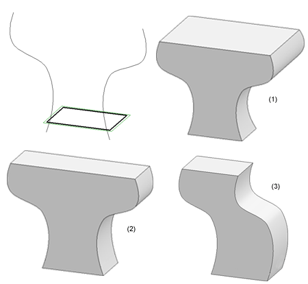 verlegt die Skizze in Originalgröße, d.h. die an der Leitlinie verlegten Querschnitte entsprechen in Größe und Form exakt der identifizierten Skizze. Die Querschnitte werden an die Punkte der 1. Leitlinie angefügt und in Richtung der 2. Leitlinie verlegt.