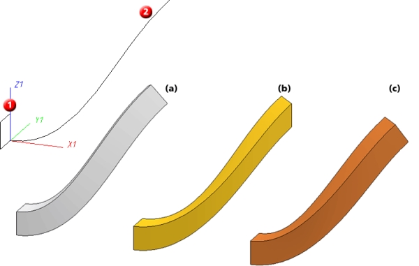 Die Skizze (1) ist an der Leitlinie (2) verlegt worden. Dabei handelt es sich um eine ebene Leitlinie. Das Ergebnis der Optionen Minimale Rotation (a) und Konstanter Winkel mit Richtung (c) ist gleich. Bei (b) ist die Verlegung mit Richtungsvorgabe erfolgt und zwar in Kantenrichtung der Leitlinie.