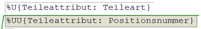 Wollen Sie bei der Beschriftung eines Teils Attribute des übergeordneten Bauteils verwenden, dann stellen Sie dem Attribut den String %U voran. Der Buchstabe U kann dabei auch mehrfach verwendet werden, um die Attribute in der Struktur noch höher liegender Bauteile zu verwenden, z.B.