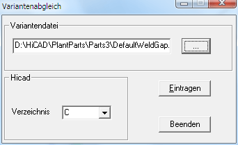 - Aktivieren Sie in HiCAD die Funktion Variantenabgleich und wählen Sie die Datei DefaultWeldGap.vaa im HiCAD Unterverzeichnis Plantparts\Parts3.