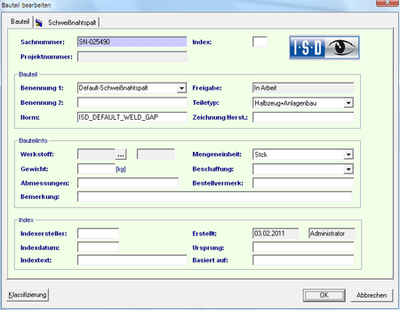 Prüfen Sie zunächst, ob die Klasse Schweißnahtspalt vorhanden ist. Aktivieren Sie dazu in HELiOS die Bauteilsuche, klicken Sie auf die Schaltfläche Klassifizierung und öffnen Sie in der Klassenstruktur die Klasse Anlagenbau.