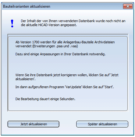Wenn Sie aber HiCAD-Anlagenbau verwenden möchten, klicken Sie auf Jetzt aktualisieren. Damit wird das Tool zum Anpassen Ihrer Datenbank gestartet.
