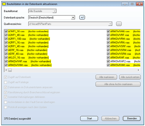 Nach der Aktualisierung klicken Sie auf Beenden und starten Sie HiCAD erneut. Der Bauteilbestand ist nun in HiCAD-Anlagenbau verwendbar.