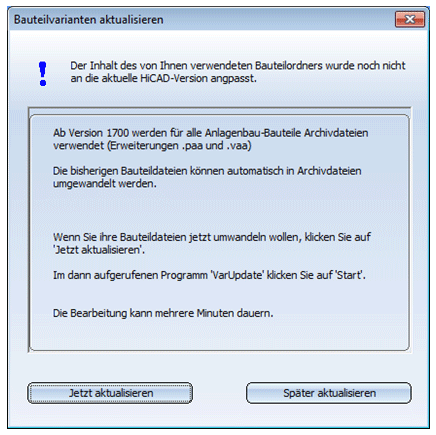 Wenn Sie zurzeit nicht mit den HiCAD-Anlagenbau-Modulen arbeiten wollen, können Sie auf Später aktualisieren klicken und HiCAD wie gewohnt verwenden. Erst beim nächsten HiCAD-Start wird dieses Fenster wieder erscheinen.