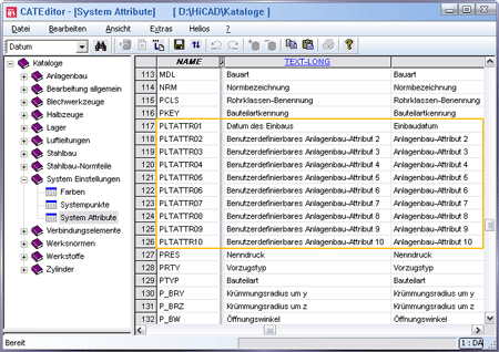 - Um eines der für den Anlagenbau vorbereiteten Systemattribute zu ändern, scrollen Sie zu der entsprechenden Zeile, z.B. zu der Zeile mit dem Attribut PLTATTR01.