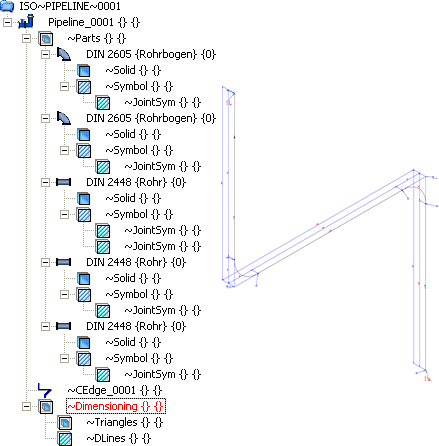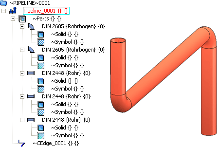 Beim Anlegen von Rohrleitungen erzeugt HiCAD die Teilestruktur automatisch, unter Berücksichtigung der oben aufgeführten Konventionen für den Teilenamen.