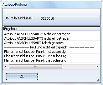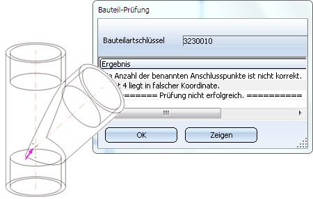 Die Ergebnisse der Prüfung werden in einer Dialogbox protokolliert. Haben Sie also beispielsweise als Bauteilart Abzweig gewählt, dann wird jetzt geprüft, ob die Geometrie die für die Bauteilart Abzweig notwendigen Voraussetzungen erfüllt. Das Ergebnis der Prüfung wird anschließend in einem Dialogfenster angezeigt.