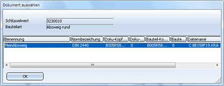 HiCAD zeigt in einer Dialogbox alle Bauteildatensätze (allgemeiner Typ) an, die in der Datenbank zu dieser Bauteilart vorhanden sind.