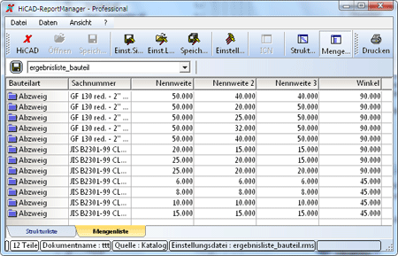 Über die Schaltfläche Liste drucken haben Sie die Möglichkeit, eine Liste aller zugeordneten Bauteile zu erstellen. Die Liste wird im HiCAD Report Manager angezeigt. Nutzen Sie die Funktionen des Reportmanagers, um die Liste zu speichern. Ausführliche Informationen zum Reportmanager finden Sie in dessen Online-Hilfe.