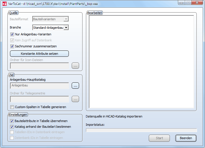 Nach Beenden des Varianteneditors wird automatisch das Programm VarToCat aufgerufen, mit dem Sie die Bauteildaten aus einer VAA-Datei in den HiCAD-Katalog übertragen können. Als Fenstertitel wird der vollständige Pfad der neu abgeleiteten VAA-Datei angezeigt.