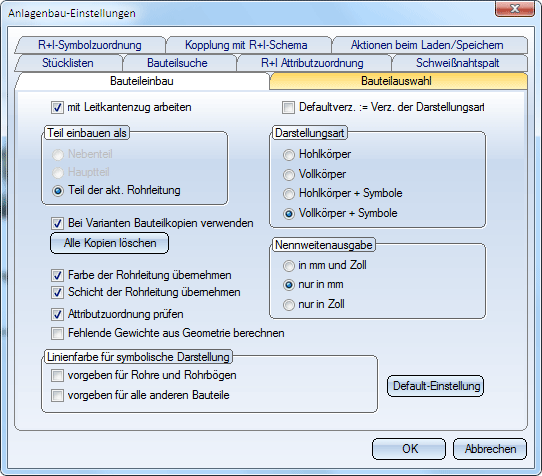 Mit dieser Funktion werden wichtige Grundeinstellungen für den HiCAD Anlagenbau festgelegt. Die Dialogbox ist dabei in folgende Registerkarten aufgeteilt: