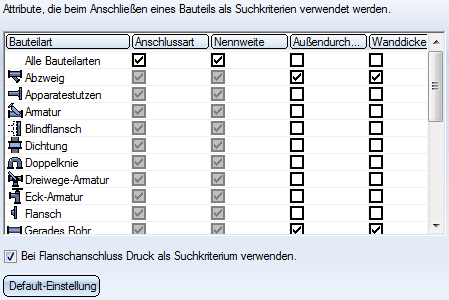 Soll ein Flansch an einen Flanschanschluss eines anderen Bauteils angeschlossen werden, dann wird, wenn diese Option gesetzt ist und dem anderen Bauteil ein Wert für das Attribut Druck zugeordnet ist, dieser Druck als Suchkriterium bei der Suche des Flansches verwendet.