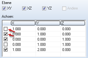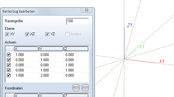 Standardmäßig sind drei Achsrichtungen vorgegeben und aktiviert, die parallel zum aktiven Koordinatensystem liegen. Steht bei einer Achse nur in einer Spalte ein Wert, dann verläuft die Achse parallel zu der entsprechenden Koordinatenachse des aktiven Koordinatensystems (Weltkoordinatensystem oder lokales Koordinatensystem). Die Höhe dieses Wertes spielt dann keine Rolle.