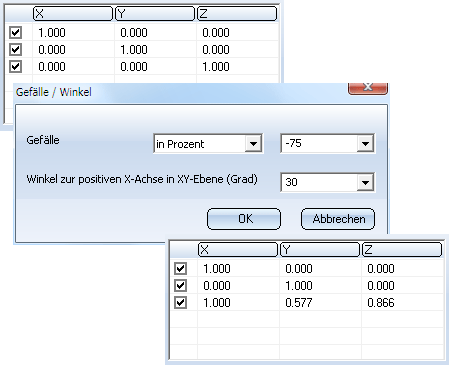 Mit einem Rechtsklick auf die Zeile der Achse und der Wahl des Menüpunktes Gefälle und Winkel im Kontextmenü haben Sie die Möglichkeit, die Richtung einer Achse zu bearbeiten. Ändern Sie den Wert für Gefälle und/oder Winkel und bestätigen Sie mit OK. Die gewählte Achse wird dann umgerechnet.