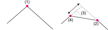 Mit dieser Funktion kann der Eckpunkt eines Leitkantenzuges, in dem zwei Kanten verbunden sind, durch eine weitere Kante ersetzt werden. Dabei entstehen zwei neue Eckpunkte.