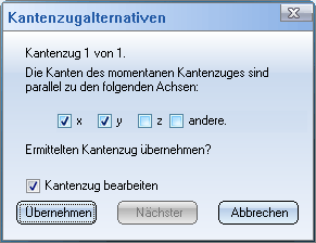 In diesem Fenster zeigt Ihnen HiCAD die Anzahl der möglichen Kantenzugalternativen an. Mit der Schaltfläche Nächster können Sie bei mehreren möglichen Verläufen zur nächsten Alternative blättern. Darüber hinaus wird für den aktuellen Kantenzug angezeigt, zu welchen Achsen seine Kanten parallel sind.