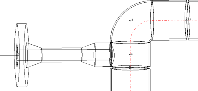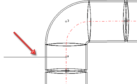 Zeichnen Sie vom gewünschten Abzweigpunkt auf der Mittellinie des Bauteils, von dem abgezweigt werden soll, einen Leitkantenzug in die vorgesehene Richtung zum vorgesehenen Ziel. Beachten Sie bitte, dass dieser Leitkantenzug, wenn ein Sattelstutzen als abzweigendes Bauteil vorgesehen ist, mit seiner ersten Leitkante senkrecht auf der eben genannten Mittellinie stehen muss.