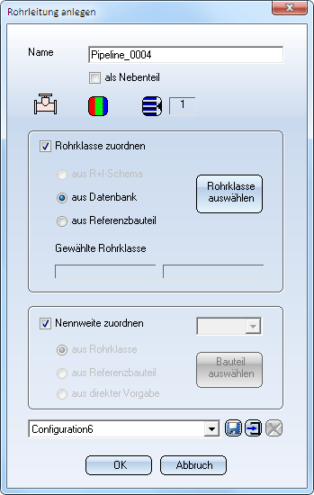 Eine Konfiguration ist vollständig, wenn sie mit dem Klick auf OK übernommen werden kann, ohne dass noch eine Rohrklasse oder die Nennweite ausgewählt werden muss. Sie ist unvollständig, wenn die Checkbox für die Rohrklasse gesetzt ist, aber noch keine Rohklasse ausgewählt wurde oder wenn die Checkbox für die Nennweite gesetzt ist und noch keine Nennweite gewählt wurde.