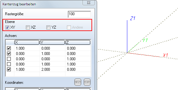 In HiCAD 2013 haben Sie die Möglichkeit, Achsen ein- bzw. auszuschalten, die in Ebenen liegen, die von den Achsen des aktiven Koordinatensystems aufgespannt werden.