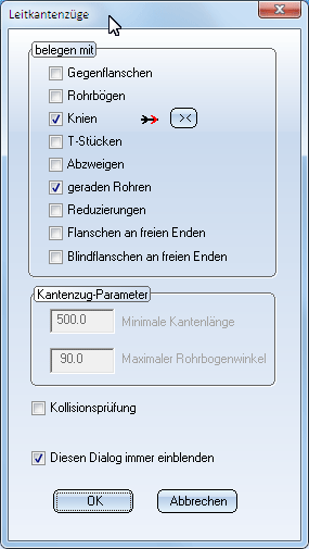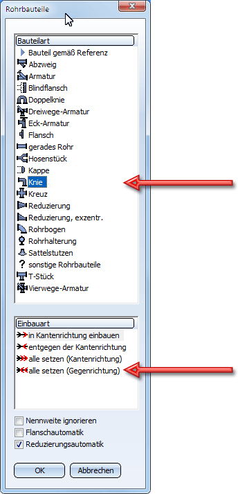 Wie Rohrbögen können auch Bauteile der Bauteilart Knie auf einzelne oder automatisch auf alle Ecken eines Leitkantenzuges gesetzt werden. Im Unterschied zu Rohrbögen müssen diese Bauteile aber nicht unbedingt symmetrisch sein. Daher kann hier die Einbaurichtung gewählt werden.