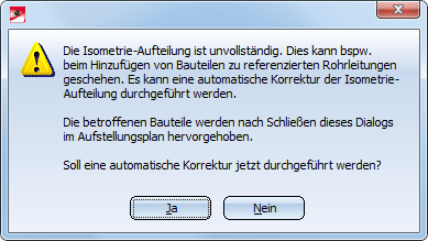 Bei der erneuten Generierung der Isometrie aus dem Aufstellungsplan prüft HiCAD daher, ob es Bauteile gibt, die keiner Teil-Isometrie zugeordnet sind. Ist dies der Fall erfolgt eine entsprechende Warnung. (SP2)