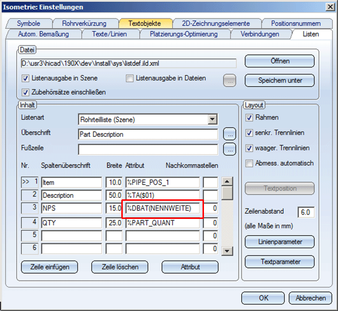 Bisher musste in der Rohrleitungsisometrie das Schriftfeld im DIN Rahmen zwangsweise "SCHRIFE" heißen. Dies ist jetzt an die Standard-Vorgehensweise in HiCAD angepasst werden. Das bedeutet, dass sowohl Rahmen mit und ohne Teilestamm möglich sind und nun die korrekte Bezeichnung des Textfeldes "SCHRIFE" aus der Systemdatei schrfeld.dat gelesen wird. (SP2)