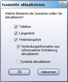 Standardmäßig sind alle Checkboxen aktiv. Sie haben jedoch die Möglichkeit, Elemente von der Aktualisierung auszunehmen, indem Sie die entsprechenden Optionen einfach deaktivieren. Beim Aktualisieren einer Verbindungsliste, können die Verbindungsinformationen direkt aus der referenzierten Rohrleitung neu kopiert (z.B. nach Änderungen im Aufstellungsplan) sowie die Verbindungssymbole auf der Leitung aktualisiert werden. Wenn lediglich Änderungen in der Teile-Datenbank vorgenommen wurden (Bezeichnung etc.), sind diese Funktionen nicht notwendig und können daher deaktiviert werden.