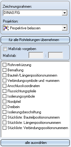 Für jede Rohrleitung lassen sich unterschiedliche Zeichnungsrahmen für die Isometrie verwenden. Wählen Sie einfach den gewünschten Rahmen aus der Listbox aus.