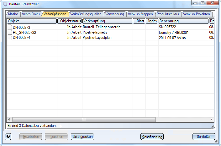 Das Rohrleitungs-Bauteil erhält im gezeigten Beispiel Verknüpfungen mit mehreren Dokumenten: (1) „Bauteil-Teilegeometrie“ mit dem Teilegeometrie-Dokument (.KRA), (2) „Pipeline-Layoutplan“ mit dem Aufstellungsplan und (3) „Pipeline-Isometry“ mit einem erzeugten Isometrie-Dokument.