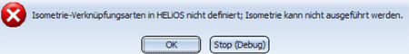 Alte Dokumente mit den bisherigen Verknüpfungsvarianten können gelesen werden, allerdings kann es beim Bearbeiten (insbesondere Neuerzeugung von Isometrien) zu Schwierigkeiten kommen; es wird empfohlen, vor der Neuerzeugung einer Isometrie eventuelle vorherige Isometrie-Dokumente zu löschen (z.B. per „Isometrie zurücksetzen“). Wenn die neuen Verknüpfungsarten in HELiOS nicht definiert sind, erscheint eine Fehlermeldung beim Versuch, die Isometrie zu starten: